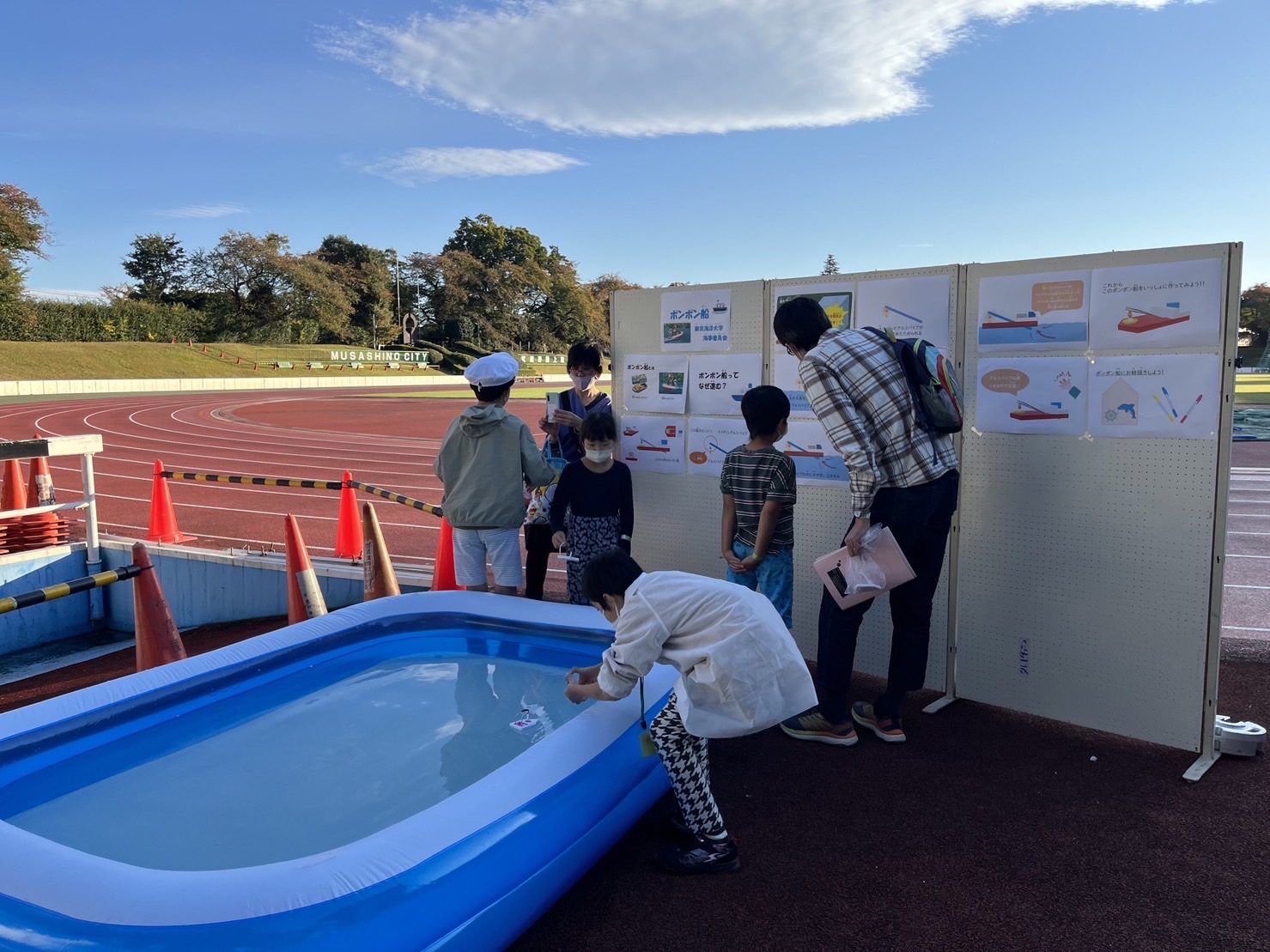 こちらのイベントは、小中学生を対象に、「身近で不思議な実験を体験して、楽しく科学を学ぼう。」というテーマで開催されました。そして、海事普及会では参加者と一緒にポンポン船を作り、作った船をビニールプールに浮かべて走らせました。